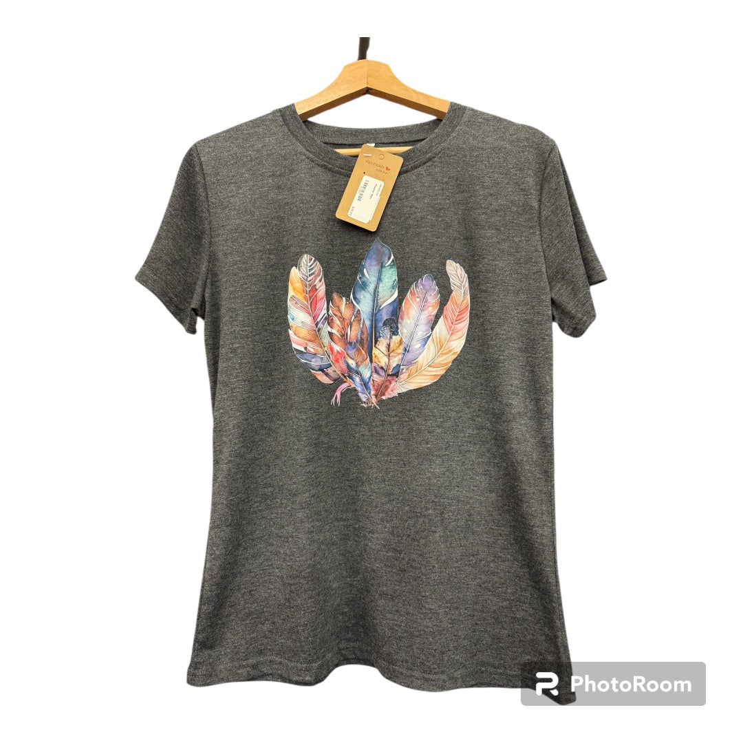 This adult small short sleeve t-shirt features a feather design, combining comfort with subtle style. Crafted for a tailored fit, it offers breathable fabric ideal for everyday wear. Perfect for those seeking a lightweight, versatile shirt with a refined touch.